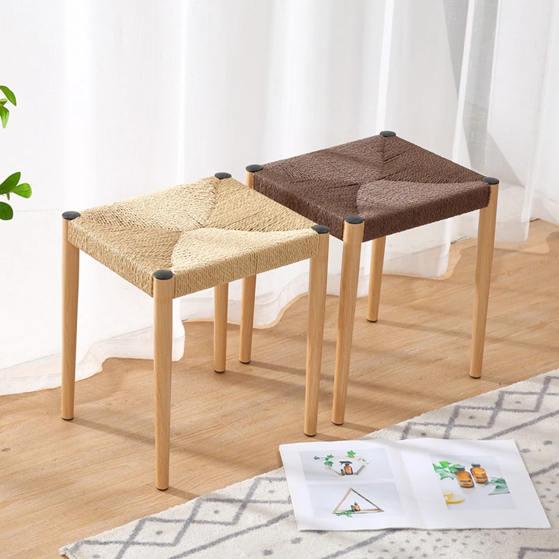 Handwoven Rattan Cotton Rope Stool - Stylish Iron Frame Dining Chair, Versatile Stackable Square Bench, Rustic Faux Wood Design for Home Use, Perfect for Dining or Makeup Areas.
