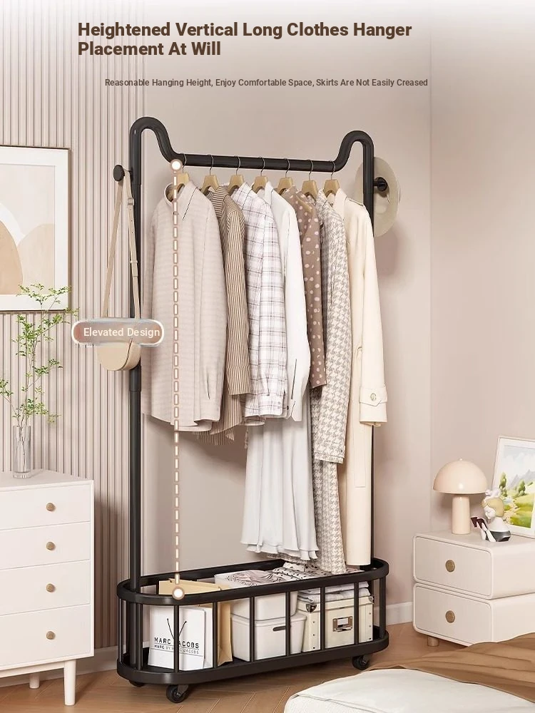 Stylish Floor-Standing Coat Rack with Storage Basket - Mobile Clothes Hanger for Bedroom, Elegant Indoor Clothing Organizer, Perfect for Home Use
