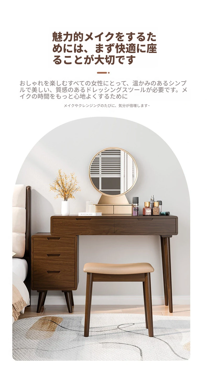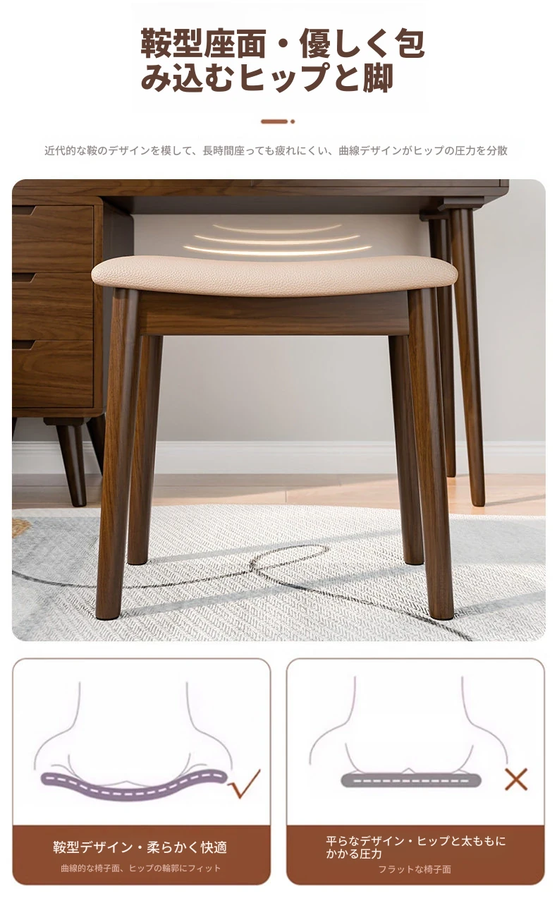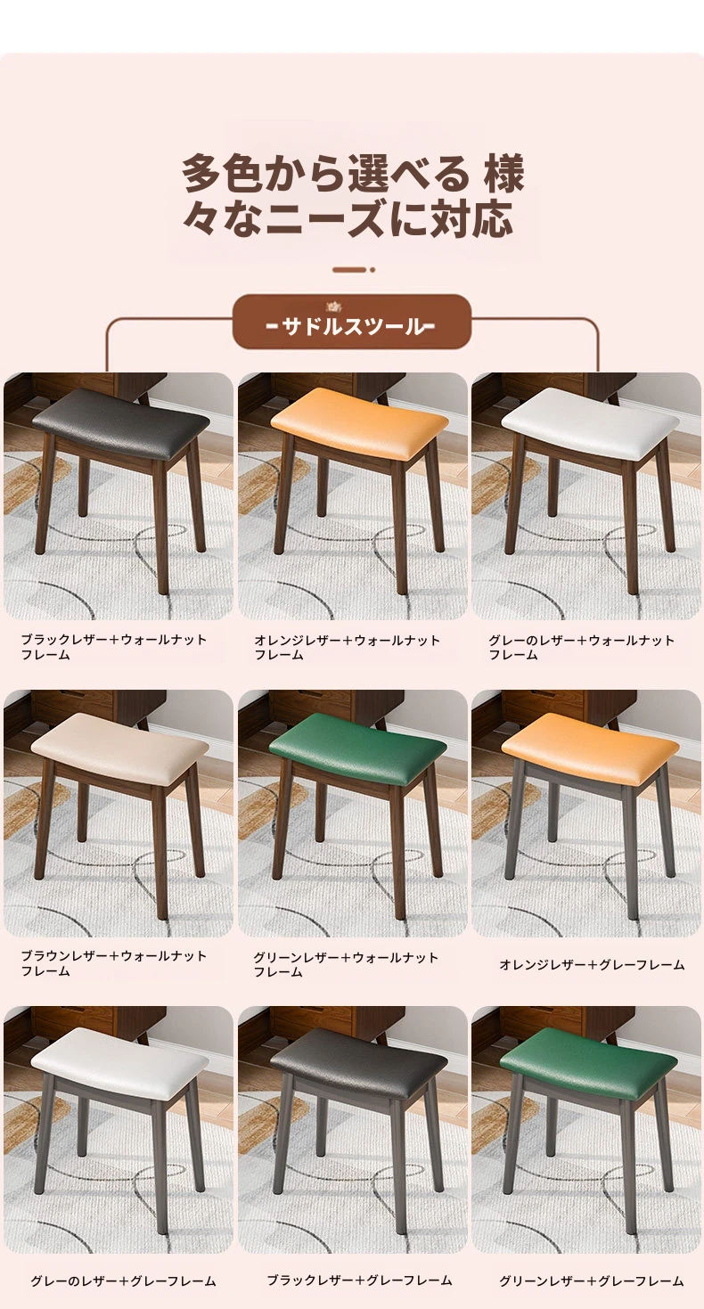 おしゃれな寝室用ドレッサーチェア!人気のメイクチェアとして、実用的な低座椅子。エレガントなデザインのウッドサドルスツールは、女性にぴったりの化粧用スツールです。自宅でのメイクアップタイムを特別なものに!